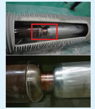 2.2.2 套管解体将故障套管进行解体验证,在套管顶部1/3处锯开1个1500 mm×600 mm的窗口,露出套管导电杆和电容芯子。检查发现铜导电杆靠近铜铝过渡接头处有过热变色痕迹,如图 4所示。