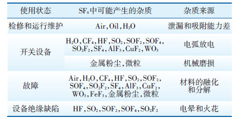1.2 SF6气体检测以SF6作为绝缘气体的电气设备在运行过程中会产生各种类型的缺陷,如泄漏、电弧放电、机械磨损、材料的融化和分解、电晕和火花等,这些缺陷会造成SF6气体成分发生改变。SF6气体检测技术就是通过检测SF6气体中各成分的体积分数,确定设备缺陷的类型。根据实际经验,总结出SF6气体中主要杂质的来源如表 1所示。