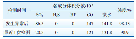 (2)发现温度异常后,立即对该套管开展SF6气体检测,并与最近1次检测结果进行对比,对比结果见表 2。
