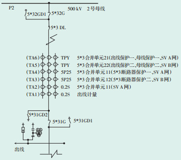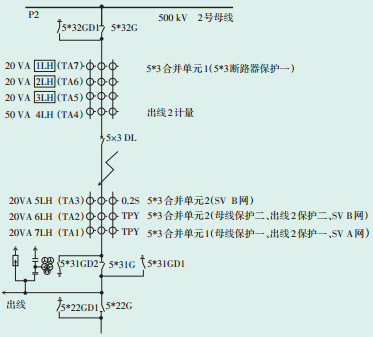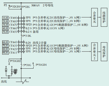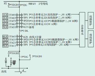 2.3 改进方案存在的问题通过分析以上解决方案,发现对于线路保护和母线保护,虽然TA的二次绕组与保护分别一一对应,差动保护的死区也彻底消除,但相对应的1套母线保护和线路保护共用1台合并单元(见图 3)。显然,当其中1台合并单元故障时,接入该合并单元的线路保护和母线保护将同时失去功能,只剩单套保护,大大降低了可靠性。