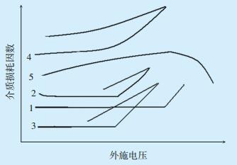 2.3 理论基础及关键技术 2.3.1 介质损耗曲线与绝缘缺陷的关系测量介质损耗是判断电气设备绝缘状况的有效方法,通过介质损耗可以发现电力设备绝缘受潮、劣化变质、小体积被试设备贯通和未贯通的局部缺陷。通过实验室大量试验论证,得出介质损耗因数与外施电压的关系如图 2所示。