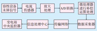 电流传感器以抱箍的形式固定在设备支撑柱上,电容式电压互感器末屏电流信号通过专用接地电缆穿过传感器,然后接地。现场测量单元通过RS485方式汇总至智能电子设备(IED),通过IED汇总、转换、计算数据信息,再通过网络将数据发送至信息处理中心进行分析和判断。系统结构图如图 3所示,单路信息采集处理流程图如图 4所示。