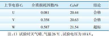 2015-06-21,介损监测数据由初始的0.04%增长至0.353%,介损变化率成百倍增长,电容变化率达到5.3%。按《输变电设备状态检修试验规程》要求,电容初值差达到2%(注意值)即为超标[6]。现场申请停电后,采取停电试验,测得介损值为0.587%,超标(标准规定为≤0.5%),电容初值差也超出标准范围,试验数据如表 1所示[6]。经返厂解体检查,发现该电容式电压互感器上节电容中部分存在击穿现象,由于内部结构为小电容单元串联而成,故有部分电容击穿后,会导致电容量及电压增大,更换后运行正常。