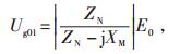 图中:CG∑—发电机出口对地总电容;Cm—主变压器高低压绕组间耦合电容;Ug0—主变压器耦合至发电机的零序电压;E0—主变压器单相接地时的零序电压;ZN—中性点对地等效阻抗 图 3 发电机定子单相接地等效电路 |