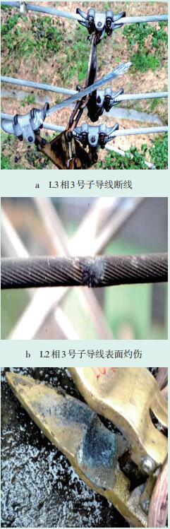 1.2 导线断裂受损情况停电15 d后,48号杆塔3根工作接地线挂设处的输电导线断线或严重灼伤:L3相(右边最靠近B线路)3号子导线断线,接地线线夹内外均有严重灼伤痕迹;L1相(中相)3号子导线外层铝股断裂,导线外侧和接地线线夹内有明显灼伤痕迹;L2相(左边最远离B线路)3号子导线表面严重灼伤,接地线线夹外侧有灼伤痕迹。三根接地线的接地端均接触良好,无放电痕迹,接地线上的软铜线均无灼伤痕迹。导线及接地线线夹受损情况如图 1所示。故障发生后对1号、47号、144号杆塔上挂设的接地线进行检查,均无异常。