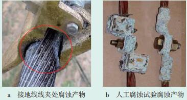 虽然47号杆塔的感应电流也较大,且与48号杆塔处于相同环境,但其接地线线夹为铝合金材质,与导线不构成原电池效应,故未发生电化学腐蚀现象。