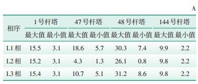 2.1.2 线路感应电流仿真计算A线路感应电流与邻近的B线路电流有密切关系,在停电的15 d内B线路电流最大值为897 A,最小值为187 A。以48号杆塔最大感应电流实测值为基础,结合B线路负荷情况模拟不同位置的接地线感应电流,结果见表 2。结果显示48号杆塔接地线感应电流显著大于其他位置接地线的感应电流。