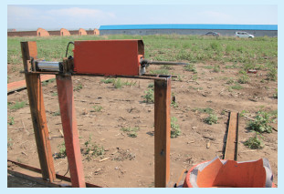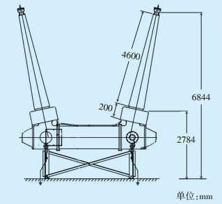 3 试验过程 3.1 试验准备本次试验地点选取内蒙古自治区呼和浩特市郊区空旷地带,四周地势平坦,试验区域无建筑物和树木遮挡。试验当天天气晴朗,无风,温度20 ℃。测试对象为2支表面涂刷有防爆破飞溅涂料的500 kV断路器瓷质套管,涂层厚度分别为2 mm和1.3 mm。瓷质套管底端对地距离为200 mm,顶端对地距离为4800 mm,上下法兰与套管采用螺栓连接,中间加石棉垫,结合面涂敷液体密封胶密封。下法兰设有充气孔,连接充气管、气压表和球阀开关等气路组件。为了模拟套管在实际运行下的状态,2支试验套管内均充有0.6 MPa空气,与在运套管额定气体压力一致。试验由图 4所示的电动机构触发。触发机构尖端高度约1 m,位置处于套管直径较大部位。