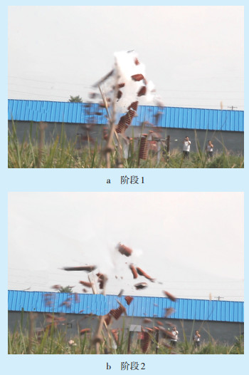 套管爆破现场要求人员撤离到安全距离以外,开启录像设备,接通电镐电源,连续冲击套管瓷体,直至套管爆裂。图 5所示涂层厚度为2 mm的试验套管在冲击爆破时碎片飞溅过程。