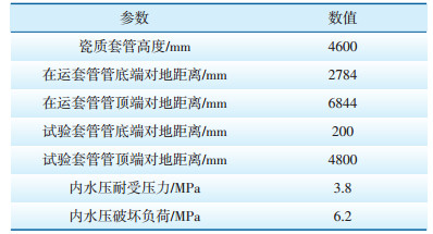 1.2.2 试验套管本次试验套管为国内某制造厂家生产的2支500 kV断路器瓷质套管,试验套管与目前500 kV变电站在运套管属同批次采购,生产日期为2012年。作为备用器件,设备型号和参数与在运瓷质套管一致,瓷质套管内部釉面光滑,外表面无破损痕迹,在网内无使用记录。瓷质套管相关参数见表 2。在运500 kV瓷质套管尺寸如图 1所示。
