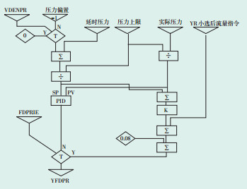 2.1 压力控制器分析图 1为压力控制器逻辑简图。压力控制器指令(YFDPR)和转速负荷控制器指令(YNPR)及启动装置控制器(TAB)输出取小得到小选后的流量指令(YR),经过高压调节阀特性曲线转换后直接控制高压调节阀的开度。