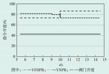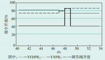 3 扰动原因此次切换与其他日常操作无明显区别,即操作员发出协调请求CCS指令,脉冲3 s,DEH接收信号,并立刻对YFDPR和YNPR做出调整,YFDPR上升,YNPR下降,在1 s后完成切换。但在此次切换过程中,YFDPR上升动作与YNPR的下降动作之间有大约1 s的间隔,造成YR上升、调节阀指令输出,调节阀开度瞬间达到80%,导致负荷波动。