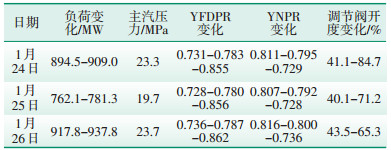 Ovation系统在历史站的数据记录中,采样周期为1 s,在没有事件顺序记录(SOE)点的情况下,对于不同站同1 s内数据仅凭历史站的记录无法判断其先后顺序,需要根据逻辑结合实际动作情况进行分析。本文采集了1月24日以来的初压/限压模式切换过程中3次调节阀开度发生明显变化的数据,见表 1和图 3。由图 3可以看到,在切换过程中调节阀开度发生了跳变,且开关调节阀时间小于1 s。根据数据及逻辑分析,可以得出2种可能性:YFDPR上升动作提前或YNPR下降动作滞后。只要切换中存在时间差,就必然会产生1个YR的波峰值,送至高压调节阀,令调节阀开度增大,导致负荷波动,切换则变成有扰切换。同时对压力控制器和转速负荷控制器逻辑页内时序进行检查,符合时序要求。