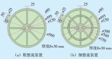 装置采用蜘蛛网状结构,通过整流作用将高速柱状水流打散,使流场分布更均匀、,减小水流的冲击力。为避免1组装置整流效果差,共设计加装3级装置,初级为粗整流装置,后2级为细整流装置。经过3级整流装置处理后,可以彻底消除柱状水流的冲击,降低噪声等级。