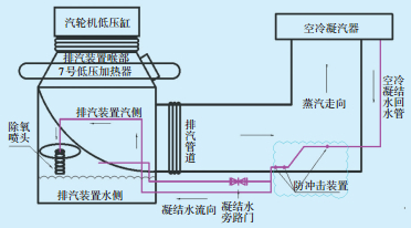 凝结水管标高落差较大,排汽装置为负压区域,对水流有抽吸作用[3],再加上落差的作用,导致流体从上部高速冲泻而下,在凝结水管弯头处发生撞击,产生高频的撞击声。同时,这种撞击也是导致凝结水回水不畅的重要原因[4-6]。