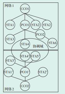 宽带载波通信网络是以CCO为中心、以PCO为中继代理,连接所有STA的多层级树形网络[7]。在新增节点或重新组网时,就有可能形成多个异构网络共存的环境,此时形成如图 1所示的网络拓扑。