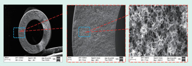 从膜丝SEM图像可以看出,膜丝内部为光滑的空腔结构,截面孔道均匀清晰。