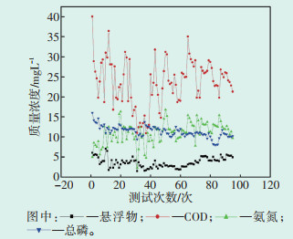 出水COD存在个别超标情况,且去除效果变化幅度较大。测试期间,系统对污染物的去除效果见图 4。