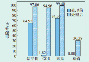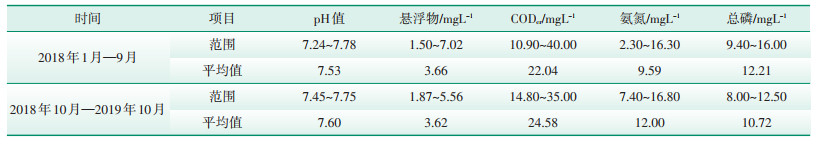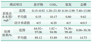 3.2 处理效果分析于2018年1月至2019年10月对系统出水水质进行检测,并对悬浮物、COD、氨氮以及总磷的处理效果进行了计算分析,测试结果如表 4所示。