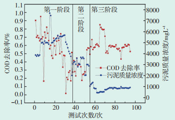 系统从2016年开始投运到2017年年底,MLSS控制在4~8 g/L运行。由于再生水来水有机物含量低,污泥负荷在0.02 kg-COD/(kg-MLSS.d)以下,导致微生物消亡速率大于繁殖速率,活性污泥的活性不断降低,出水水质变差[10]。为了改善这种情况,于2018年初向生物曝气池内投加工业葡萄糖,投加方式为每6 h投加2 kg,以提高污泥负荷,增强微生物活性,情况得以改善。但要维持高的污泥浓度,就要减少排泥操作,这使得曝气池内污泥龄较高,导致水中因微生物内源呼吸作用而产生胶体物质,从而引起MBR膜运行跨膜压差增大,膜丝有污堵风险。故于2018年9月停止投加工业葡萄糖,从10— 12月系统对COD的去除率降低。针对这种情况,于2019年初,开始逐渐降低污泥质量浓度至0.5~1 g/L直到10月,相当于将污泥负荷提升8倍,约为0.16 kg-COD/(kg-MLSS.d),污泥活性提高,出水水质得到改善,COD去除率相对稳定,同时由于污泥质量浓度的降低对膜的污染压力也相应减小。为了查明系统对COD的去除效果,根据系统运行参数的调整过程将整个测试期间相应地分为3个阶段进行说明,运行调整过程及结果见图 5。