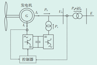 | 图 1 双馈风机结构图 Figure 1 Configuration of doubly-fed wind generator 图中:Ir、Is—转子电流和定子电流;Pr、Ps—转子功率和定子功率;US—定子侧电压;Pg、Qg—发电机输出有功功率和无功功率;E—电动势。 |