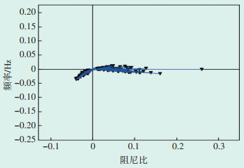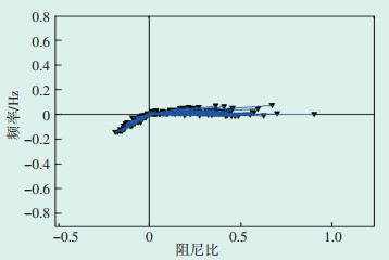 风电机组惯性在机组小出力时有利于系统的稳定。风电开机越多,每台机组出力越小,对系统动态稳定水平的提高越有利。以方式1和方式4为例,内蒙古电网对山东电网振荡模态图分别如图 3、图 4所示。对比可知,随着内蒙古风电出力增加,系统阻尼比增加,稳定特性增强。