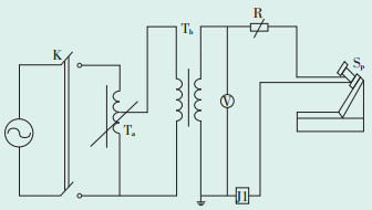 | 图 1 接线原理示意图 图中:K—电源开关;R—限流电阻;JI—过电流继电器;Ta—调压器;Tb—试验变压器;V—电压表;Sp—试样。 |