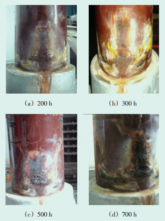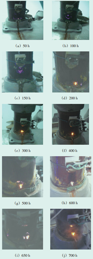 从图 3可以看出,当电蚀时间比较短,在100 h时,绝缘子的表面状况仍然良好,无漏电痕迹出现。此时绝缘子电弧从上电极向下电极发展,呈现紫色、大范围刷形放电,升压过程中,刷行放电基本持续进行。