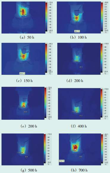 当电蚀达200 h时,放电区域最高温度超过了110 ℃;到700 h时,最高温度仍达110 ℃以上,最高温度基本保持不变。