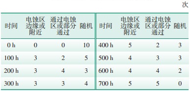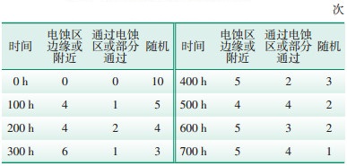 从表 6可以看出,随着试验时间的增加,试品湿闪络时的路径发生了较为明显的变化,闪络路径有趋向于电蚀区的现象,截至700 h,发生在电蚀区边缘、附近的概率为50%,通过或部分通过电蚀区的概率为50%,随机发生的概率为0。