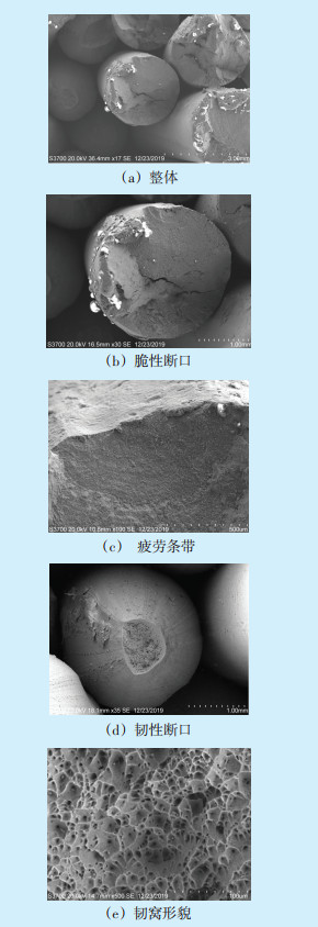 扫描电子显微镜(SEM)检测结果显示,绝缘导线导体中各铝单丝的断口主要呈两种形态,一种形态为9根呈脆性断裂的铝单丝,其断口上均有部分区域呈典型的疲劳断裂形貌特征,可以观察到明显的疲劳条带;另一种形态为其余10根具有明显颈缩的铝单丝的断口呈典型的韧性断裂特征,断口上可观察到大量的等轴状韧窝,绝缘导线断口各部位SEM形貌如图 3所示。