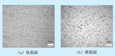 在绝缘导线近断口处的铝芯导体上取样进行金相显微组织检测,如图 5所示。由图 5可以看出,铝芯导体纵向截面的组织为纤维状的单相α相,未见回复及再结晶组织,未见明显的夹杂物缺陷存在;横断面的组织则为等轴状的单相α相,未见明显异常。