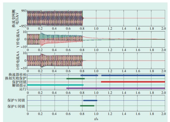 故障导致换相失败发生,从录波图(见图 1)可以看出,沂南站在0.2 s时发生换相失败,波动时间持续600 ms,0.8 s时阀组闭锁。