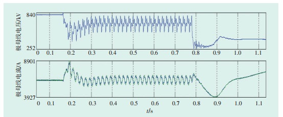 (2)当发生换相失败时,为了快速恢复晶闸管阻断能力,逆变侧控制系统将增大触发角,导致换流器无功需求增大,逆变侧交流电压降低。此时逆变侧理想空载直流电压变低,整流侧和逆变侧之间电压差增大,造成直流电流增大。整流侧检测到极母线电流增大,控制系统将增大触发角,降低整流侧理想空载电压,此时两侧电压差减小,直流电流降低。