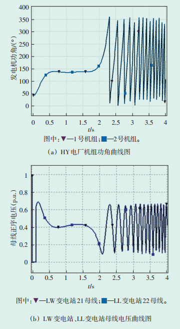 由此得出,HY电厂第3台机组投运后,该地区电网接带负荷能力下降,3台机组满负荷运行时,负荷加重,最终将导致LW变电站和LL变电站电压失稳,引起HY电厂3台机组功角失稳。该地区电网暂态稳定仿真结果如图 2所示。