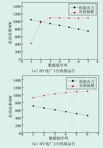 | 图 4 HY电厂不同出力下LW变电站和LL变电站负荷计算极限变化趋势图 Figure 4 Variation trend of load calculation limit of LW substation and LL substation under different outputs of HY power plant |