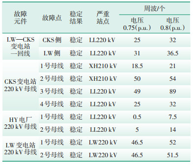 500 kV CKS变电站扩建第3台主变压器后,当HY电厂3台机组满负荷运行时,LW变电站发生一回220 kV母线故障后,LL变电站220 kV侧电压50周波内恢复到0.75(p.u.),满足运行要求。此时需控制LW变电站和LL变电站总负荷不超过420 MW,XH变电站负荷控制到800 MW。当HY电厂双机满负荷运行700 MW时,发生LW变电站至CKS变电站一回线LW变电站侧故障后,LL变电站220 kV侧电压50周波内恢复到0.75(p.u.),满足运行要求。此时需要控制LW变电站和LL变电站总负荷不超过920 MW,XH变电站负荷控制到800 MW。扩建主变压器后CKS地区接带负荷能力提高了29%。