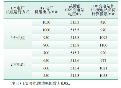 1.2 暂态稳定仿真分析在HY电厂第3台机组投运前,控制500 kV CKS变电站主变压器电压在515 kV附近,校核该地区各类线路及主变压器N-1故障,判断该地区是否可以保障电网安全稳定运行。经仿真分析,HY电厂两台机组满负荷(700 MW)运行,GY电厂单台机组满负荷(350 MW)运行时,制约故障为500 kV CKS变电站一回220 kV母线侧故障,需控制LW变电站和LL变电站总负荷不超过400 MW,且XH变电站负荷控制到800 MW时,500 kV CKS变电站一回220 kV母线侧故障后正好满足暂态电压稳定条件。故障发生后,LW变电站和LL变电站负荷母线电压能够在1 s内恢复到0.75(p.u.)以上;XH变电站负荷母线电压能够在10 s内恢复到0.8(p.u.)以上。