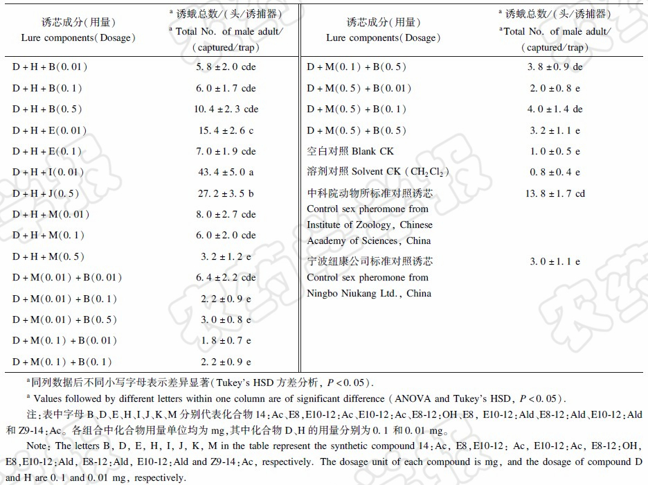田间诱捕试验数据采用SPSS 16.0软件进行统计分析,采用Tukeys' HSD进行方差分析(P<0.05)