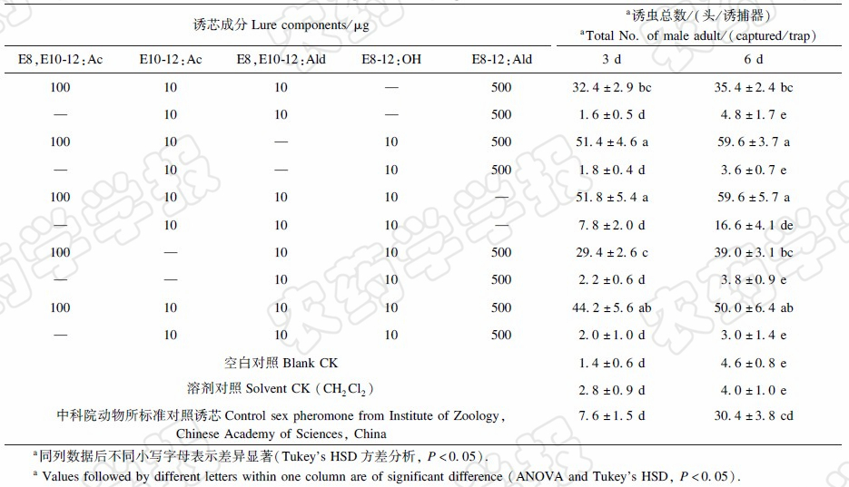 将E8,E10-12:Ac与14:Ac、E10-12:Ac、E8-12:OH、E8,E10- 12:Ald、E10-12:Ald、E8-12:Ald、Z9-14:Ac分别进行四元混配,比较其引诱活性。另设药剂对照、空白对照和溶剂对照,每处理设5个重复。试验时间为2012年8月11日~ 8月16日。