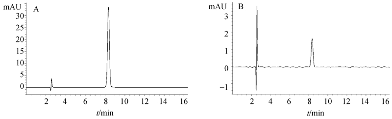 ![]() | 图 1 东莨菪内酯标样及水中的添加回收色谱图(345 nm) Fig. 1 HPLC chromatogram of scopoletin standard solution and water sample fortified with scopoletin at level of 0.5 mg/L at 345 nm |