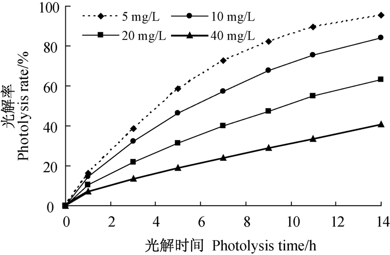 1.2.1.1 初始浓度对水中东莨菪内酯光解的影响用纯水将1 000 mg/L的东莨菪内酯母液分别稀释成40、20、10和5 mg/L的系列光反应液,于500 W 氙灯下进行光解,反应液温度控制在25 ℃±1 ℃。