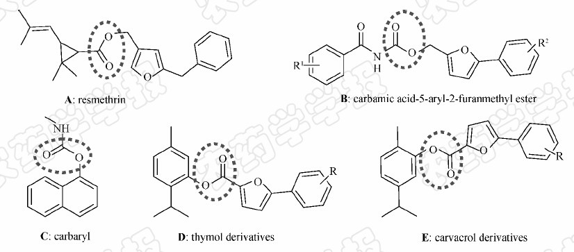 Pyrethroids[1] are one of the most famous agrochemicals included in over 3 500 registered products,many of which are widely used in and around households,including on pets,in mosquito control,and in agriculture. Carbamates[2,3] are another world wide used pesticide. Both of them contained and connected with the ester moieties (Fig. 1A,1B and 1C). In our previous study,some thymol and carvacrol derivatives containing 5-phenyl-2-furan were designed and synthesized,which was linked by ester moieties (Fig. 1D and 1E). These compounds possessed good antitumor and fungicidal activity[4].