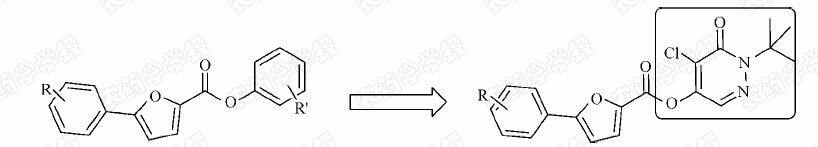 Pyridazin-3(2H)-one derivative is well known as the important scaffolds in drugs and agrochemicals[5,6,7,8,9,10],which is a good synthetic building block for constructing new bioactive compounds due to their easy-functionalization at various ring positions[11,12,13]. So the phenyl ring in our former compounds was replaced with the pyridazin-3(2H)-one (Fig. 2) and a series of novel 5-ester-pyridazin-3(2H)-one derivative with 5-phenyl-2-furan moiety were designed and synthesized (Scheme 1). Their fungicidal activity was evaluated.