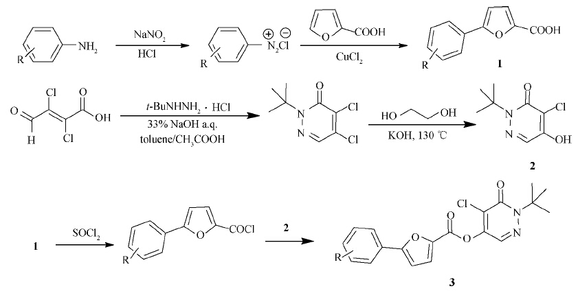 The key intermediate 5-substituted phenyl-2-furancarboxylic acid 1 was synthesized from substituted aniline by Meerwein arylation reaction according to the reported procedure[14,15,16,17,18].