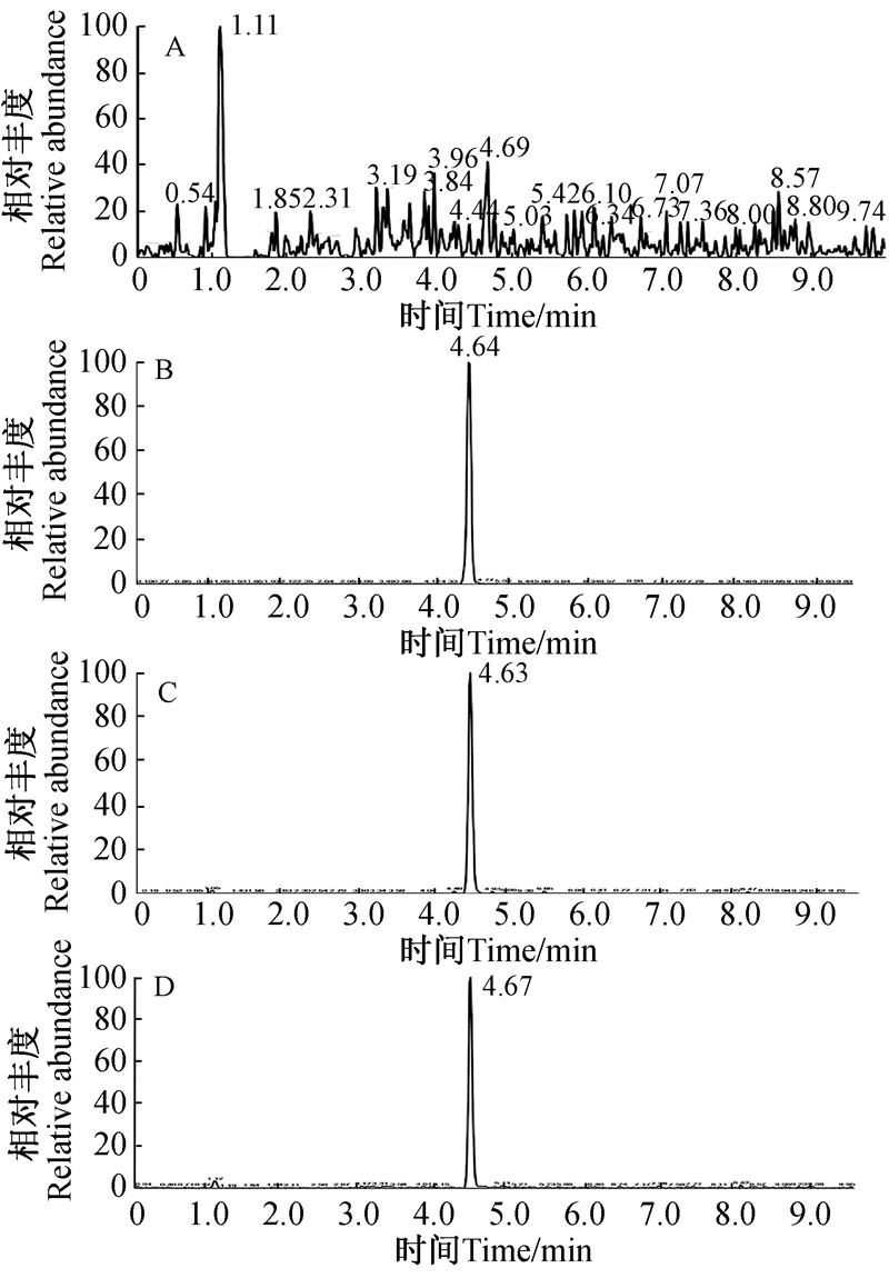 ![]() | 图 1 鲜烟叶空白(A),基质匹配标准溶液(0.1 mg/L)(B),鲜烟叶添加(0.1 mg/kg)(C),鲜烟叶样品(D) 典型色谱图(四川,21 d) Fig. 1 Chromatograms of (A) Blank fresh leaf,(B)Matrix matched standard of 0.1 mg/L,(C) Fresh tobacco leaf fortified at 0.1 mg/kg,and (D) Real fresh tobacco leaf sample (Sichuan Province,China,21 d) |