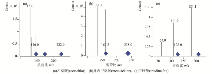 ![]() | 图 2 3种农药的二级离子质谱图 Fig. 2 MS/MS spectra of the 3 pesticides |