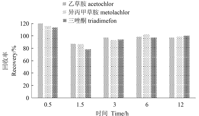 ![]() | 图 3 3种农药不同提取时间的回收率 Fig. 3 Recoveries with different extraction time of the 3 pesticides |