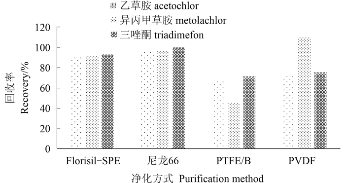 以乙腈为提取溶剂,分别对比了涡旋0.5 h及浸提1.5、3、6和12 h的提取效果。结果(图 3)表明:浸提3、6和12 h 3种农药的回收率相当,均达到100%左右;浸提1.5 h的回收率在80%左右。对比了分别过两次0.22 μm尼龙66、0.22 μm PTFE/B(聚四氟乙烯)和0.2 μm PVDF(聚偏氟乙烯)3种微孔滤膜的净化效果。结果(图 4)表明:0.22 μm尼龙66微孔滤膜净化效果优于其他两种。对比了Florisil-SPE净化柱和过两次0.22 μm尼龙66微孔滤膜的净化效果。结果(图 4)表明:两者在净化结果以及回收率方面均无明显区别。综合考虑,最终采用乙腈浸提3 h后,连续过两次0.22 μm尼龙66微孔滤膜进行净化处理。