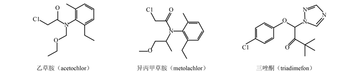 玉米可作为粮食、加工食品原料或饲料原材料直接或间接被人们食用,因此在玉米种植过程中大量使用的农药成为农产品质量安全的监测项目,其中乙草胺(acetochlor)、异丙甲草胺(metolachlor)(图式 1)是常用的除草剂,主要用于防除禾本科杂草和一些阔叶杂草。三唑酮(triadimefon)(图式 1)是一种具有多种特异性能的杀菌剂,多用于防治黑穗病、锈病和白粉病等。我国规定[1],玉米中乙草胺的最大残留限量(MRL)为0.05 mg/kg,异丙甲草胺的MRL值为0.1 mg/kg,三唑酮的MRL值为0.5 mg/kg。目前这3种农药的检测方法主要有高效液相色谱法[2, 3, 4]、气相色谱法[5, 6, 7, 8, 9]、超高效液相色谱-串联质谱法[10, 11, 12]和气相色谱-质谱联用法[13, 14, 15, 16, 17]。本研究在前人的基础上,简化了复杂的前处理过程,同时优化了检测条件,具有准确、灵敏、简单的特点。